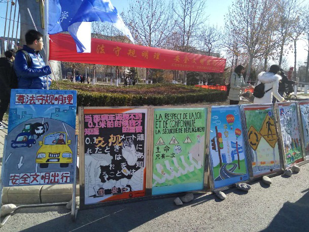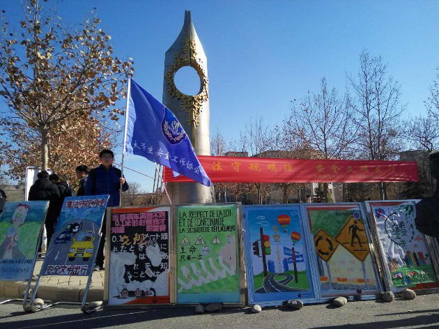 4.2017年12月4日中午,我校举办“尊法守规明理、安全文明出行” 为主题的 “2017年全国交通安全日”宣传教育活动,校大学生安全协会号召并发起各学院设计宣传海报,在学生中进行交通安全宣传;摩拜共享单车运营部门参加宣传教育活动,积极倡导“文明骑行,规范停放”,共建校园交通安全环境。